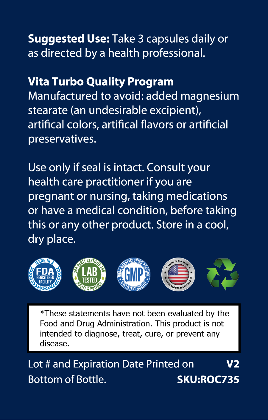 These statements have not been evaluated by the Food and Drug Administration. This Product is not intended to diagnose, treat, cure or prevent any disease.